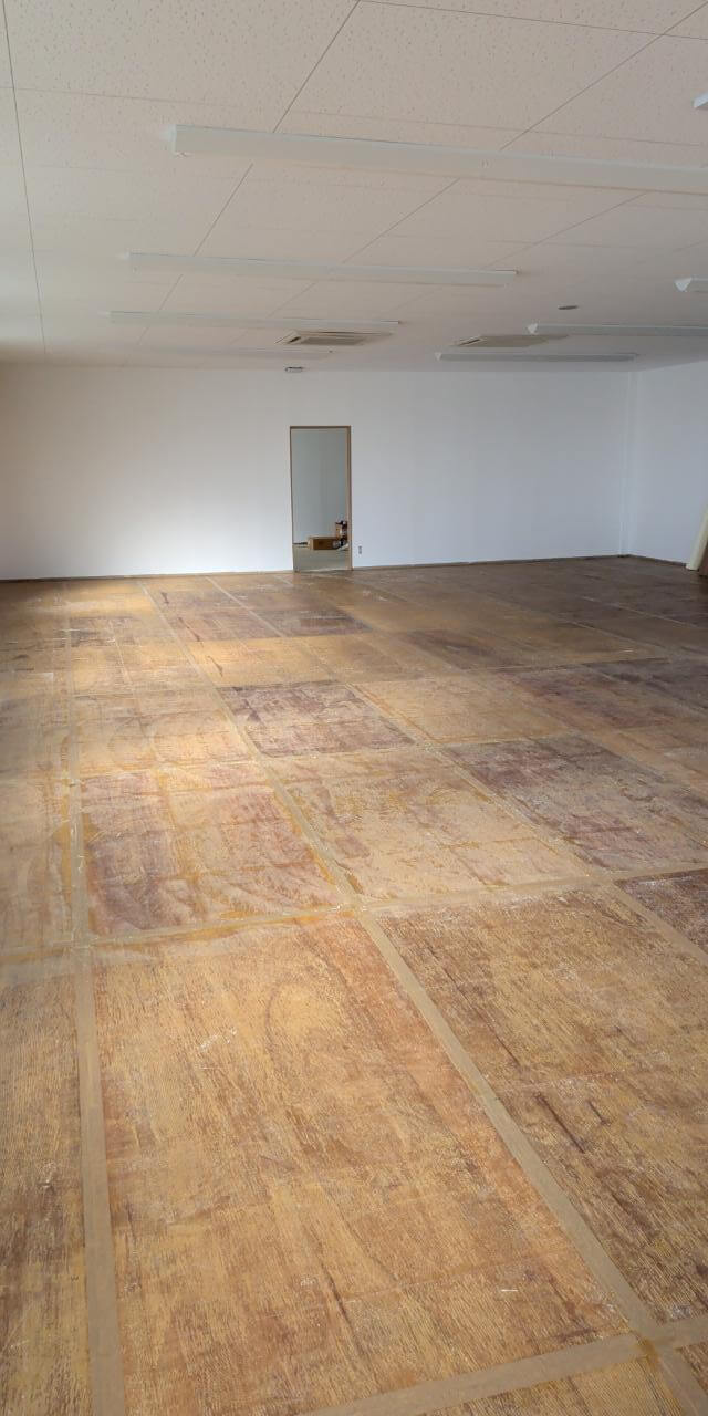 既存のカーペットタイルが古くなっていたため、全面的に新しくされたいとのこと。 新しい床材を施工する前に、まずは現在のタイルを全て剥がし、何もないフラットな状態に戻す必要がありました。